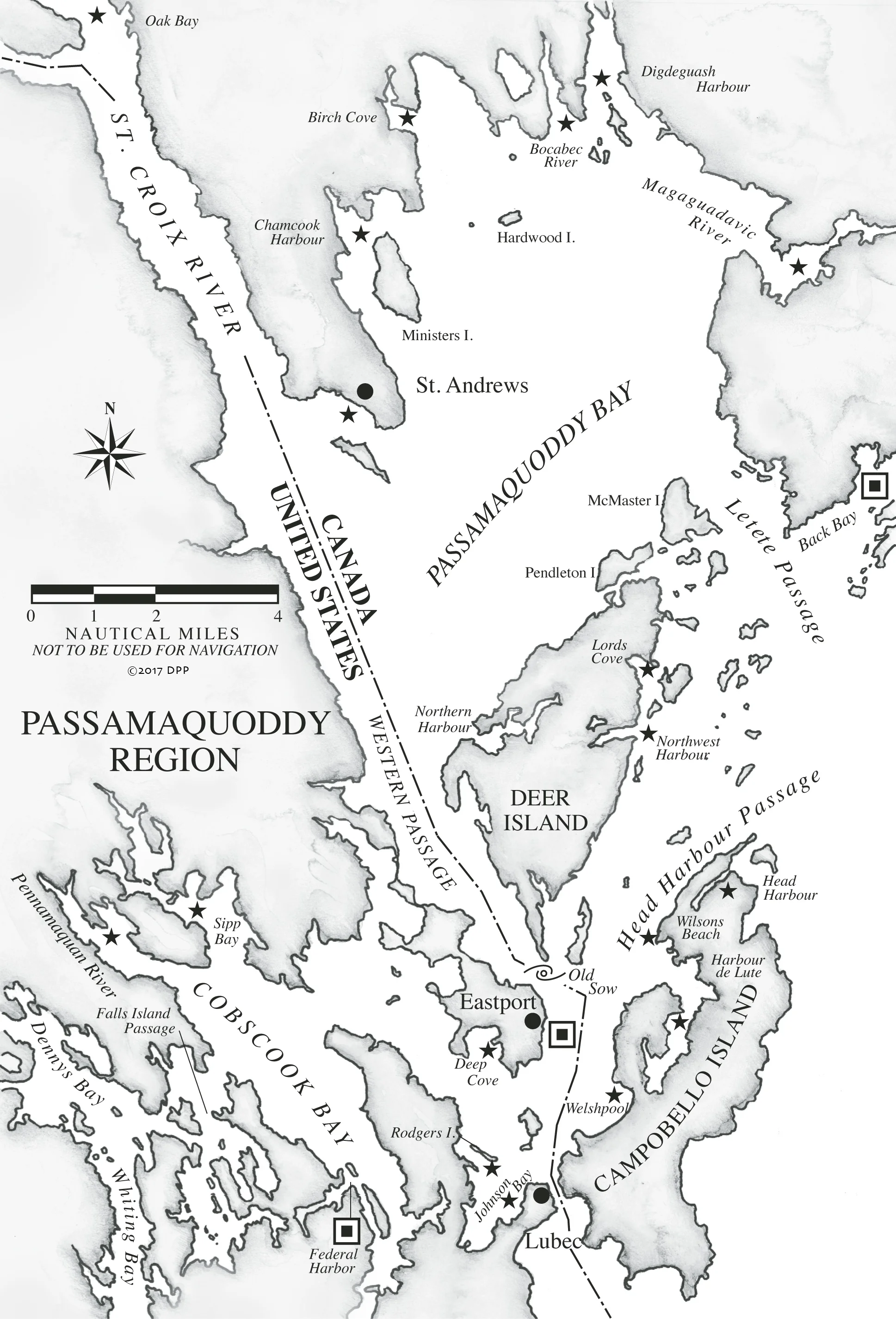 Across Lubec Narrows lies Campobello, best known for Franklin Delano Roosevelt’s summer cottage of the same name, now an international park. Due north is the splendor of Passamaquoddy Bay, teeming with fish and birds, dominated by giant tides, and guarded by swift currents and whirlpools. The St. Croix River flows into Passamaquoddy Bay from the north, marking the border between the United States and Canada. It passes St. Croix Island, where Samuel de Champlain established the first European settlement in 1604. And it empties into the bay at the resort of St. Andrews, founded by Loyalists who barged their houses from Castine when they fled from the United States in the aftermath of the American Revolution.