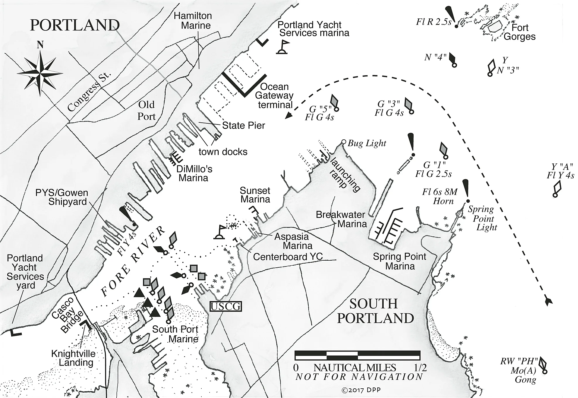 Portland Yacht Services (Ch. 09, 16; 207-774-1067; portlandyacht.com). PYS’s marina lies at the eastern end of the harbor, directly below the Portland Observatory up on the hill. Their large yard, sheds, and repair facilities are up the Fore River just beyond the Casco Bay Bridge. The Mmoorings and docks at the marina have considerable exposure, but they are within walking distance of downtown Portland. PYS moorings are massive, 4000-pounders. The floats, with water and spump-outs, can accommodate vessels to 120 feet with depths to 20 feet. At their yard upriver and at their sister site, Gowen Marine, PYS handles major restoration and repair projects to wood and fiberglass boats, including hull, engine, outboard, rigging, and electrical work, and they have an extensive engine parts department.